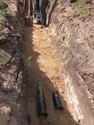 Обратите внимание на фото строительства гаража своими руками: укладку кабеля начинают с рытья траншеи глубиной не менее 0,9 м и шириной 0,3-0,6 м от точки подключения до места ввода, причем каждую из них можно оборудовать дополнительной опорой. На дно насыпают 10-сантиметровый слой песка — «подушку», на него опускают кабель, вдетый в защитный кожух из металлической трубы, и снова присыпают песком. Поверх сплошным рядом укладывают бетонную плиту, черепицу или кирпич и все это закидывают грунтом.