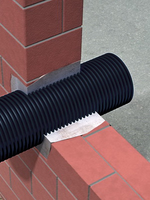 При прокладке под фундаментом или сквозь него трубу доводят до распределительной коробки, избегая внутренних соединений. Крепят к монолитной стене хомутами с помощью дюбелей, а к металлической — хомутами и саморезами.