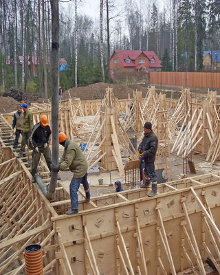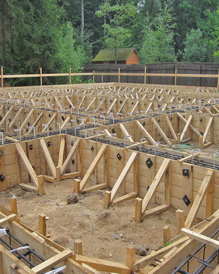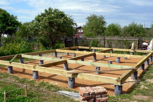 Столбы устанавливают по углам сруба и в местах пересечения внутренних стен, а когда пролет превышает 2 м, еще и посередине. Между столбами ставят опалубку, которую впоследствии заполняют бетонным раствором или любым теплоизоляционным составом.