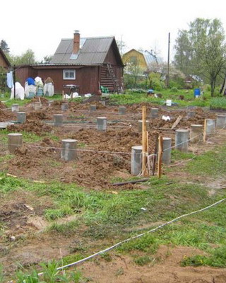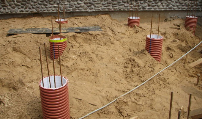 Оптимальный вариант свайного фундамента — буронабивные сваи с оболочкой из труб (металлических, асбестоцементных). Трубы погружают в грунт и заполняют бетоном. Расстояние между сваями — 1,5-2 их диаметра.