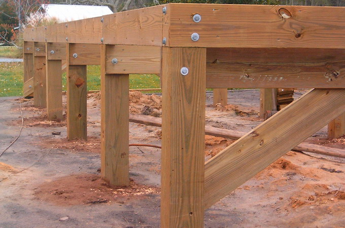 Как видно на фото фундамента под каркасный дом, прорезая слабый грунт, свая упирается в слой сильного грунта и передает нагрузку от здания на него. В большинстве случаев такие сваи имеют значительную длину, поэтому их приобретение и установка обойдутся дорого для хозяина небольшого индивидуального жилого дома.