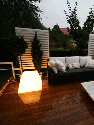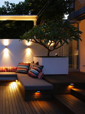Устройте на террасе и ступеньках к ней подсветку. Светильники могут быть не только на самой террасе, но и рядом с ней, подчеркивая ее форму.