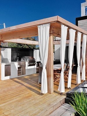 Дополнительные возможности дает близость жилого дома, вследствие этого террасу можно рассмотреть и как интерьер под открытым небом, и как часть сада одновременно. Можно все то, что в доме, и можно все то, что в саду.