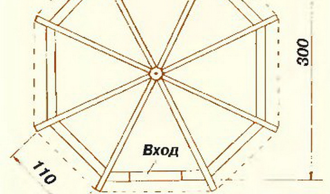 Для устройства беседок в форме многоугольников соблюдают ту же последовательность, что и для окружности. Колышки вбивают по вершинам многоугольников, предварительно разделив окружность на требуемое количество сегментов. Для шестиугольника угол поворота будет составлять 60°, для восьмиугольника — 45° и т. д. Что касается пятиугольника, то здесь делить ничего не нужно: одна сторона этой фигуры равна радиусу — достаточно отложить расстояния от исходной точки. Соответственно, для десятиугольника сторона будет равна половине радиуса.