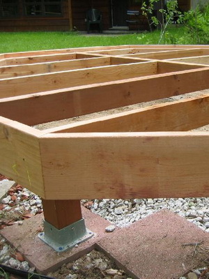 Независимо от типа фундамента в центр основания беседки заливают, вкапывают или устанавливают дополнительную опору-столбик со сторонами 400×400 мм. К ней от вершин многоугольника или по равно развёрнутым диагоналям окружности укладывают балки, образующие сегменты, — их и застилают доской для пола. Если между центром и краем основания больше 1,2 м, то под балку устанавливают дополнительный столбик сечением 100×100 мм и больше.