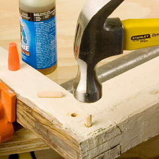 В подготовленные отверстия вбиваем нагели, смазав предварительно их клеем. После завершения работ конструкцию оставляем на трое суток при комнатной температуре под гнетом на горизонтальной поверхности. Подойдут для этого уложенные поверх рамы ровные доски, с поверх положенным гнетом – до 100 кг.