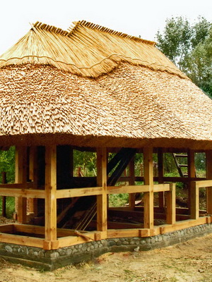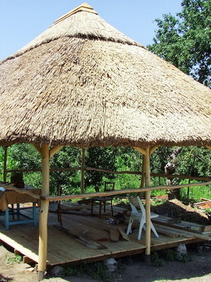 6. После того как каркас будет готов, можно приступать к созданию главного элемента — камышового навеса. Для этого просушенные и обработанные стебли камыша нужно связывать веревками в пучки толщиной примерно 10 см. Затем готовые пучки укладывают вплотную один к другому поверх полиэтиленовой пленки. Когда все пучки будут разложены, их нужно прикрепить к навесу веревкой, несколько раз перехлестнув ее через всю крышу и зафиксировав гвоздями или шурупами по краям и в середине, чтобы укрепить всю конструкцию.