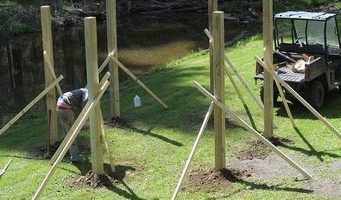 6. После того как опоры будут установлены, в лунки заливается бетонный раствор.