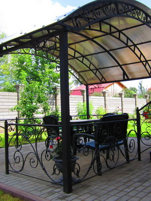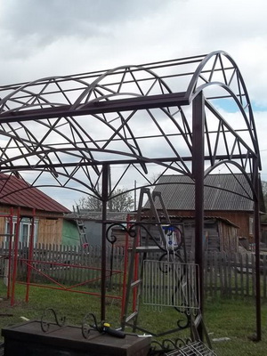 12.Каркас для такого навеса можно выполнить и из ферм. В таком случае каждая опора выполняется в виде ажурной металлической панели, имеющей высоту 200 см и ширину 50 см. Фермы необходимо соединять друг с другом с помощью карточных петель.