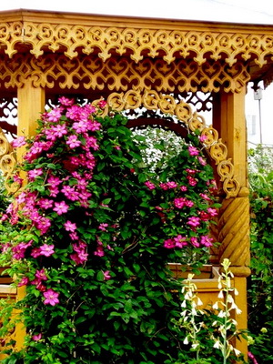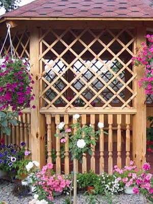 Жалюзи могут выступать в качестве декоративного элемента построек. В закрытых беседках для этой цели можно использовать также гардины и шторы.