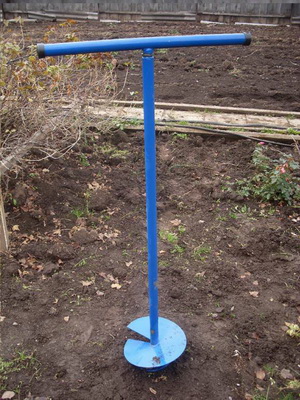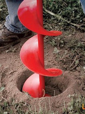 2. Ручным буром на подготовленной площадке нужно пробурить в грунте 4 скважины глубиной около 1 м для установки и бетонирования опорных стоек. Если нет бура, можно воспользоваться лопатой. Опорные стойки должны отстоять на 1,3 м одна от другой, а значит, расстояние между ямами по их осевой линии должно быть таким же. Затем в скважины вбиваются асбестоцементные трубы.