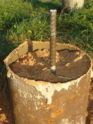 3. Для упрочения всей конструкции в нижней части ножек стоек нужно вставить в ямы куски арматуры. После этого устанавливаются опорные стойки — ножками в асбестоцементные трубы. Опоры необходимо устанавливать строго вертикально, проверяя их ровность с помощью уголка.
