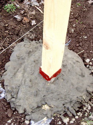 4. Для того чтобы отрегулировать положение стоек, нужно подсыпать в ямы песок с использованием деревянных клиньев. После этого в траншеи заливается бетонный раствор.