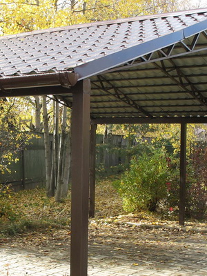 6. Когда бетонный раствор полностью застынет (на это может уйти несколько дней), подготовленные лаги прикрепляются к наклонным перекладинам (балкам) с помощью болтов и гаек. Затем навес накрывается листами керамопласта, которые закрепляются кровельными саморезами.