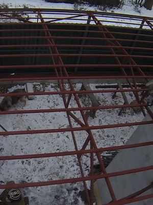 5.После того как бетонный раствор полностью застынет, подготовленные лаги прикрепляют к наклонным перекладинам болтами и гайками. Навес покрывается поликарбонатом.