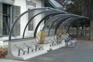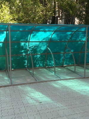 7. В завершение работы нужно на вертикальных трубах и нижних боковых перекладинах наметить и просверлить отверстия для установки стояночной решетки. Готовая решетка крепится к каркасу. Теперь конструкция окончательно готова. При желании площадку под навесом можно замостить плиткой или зацементировать.