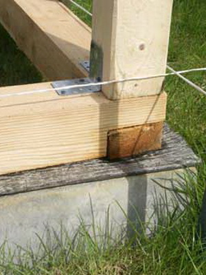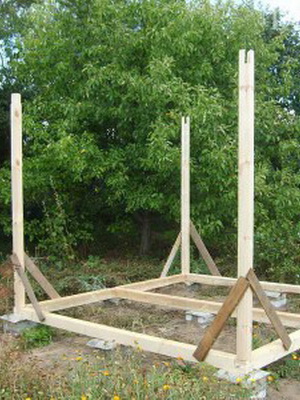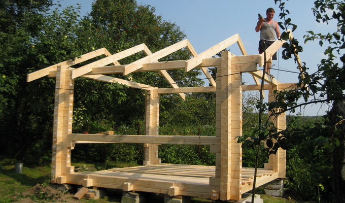 Перед тем как сделать беседку из бруса, необходимо выбрать место для будущей постройки. Для фундамента выкапываются траншеи и засыпаются галькой. Брус 8 X 10 см длиной 2,5 м прикладывается к одной панели. На нем обозначаются места, где будут располагаться стойки панелей. Выполнить отметки нужно для того, чтобы потом правильно расположить лаги. После этого в траншеи следует уложить опорные брусья 10×10 см, разместив их таким образом, чтобы они оказались точно под стойками дощатых панелей. При строительстве беседок из бруса сначала укладывается опорный передний брус, а после него и задний. Два центральных бруса размещаются после предварительной проверки горизонтальности уже уложенных.