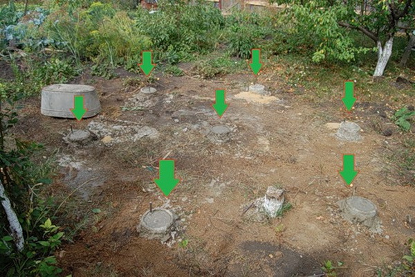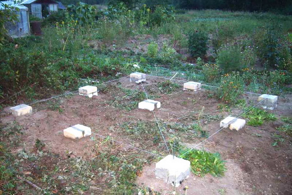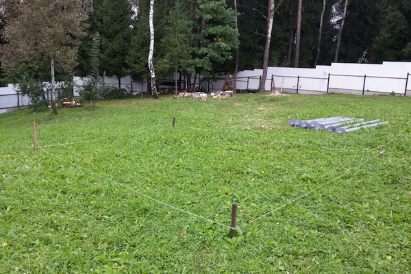 1. Площадка, выбранная под строительство прямоугольной беседки своими руками, расчищается, на ней выполняется разметка, вбиваются колышки и между ними натягивается леска. Затем снова выверяются размеры. Место входа отмечается на одной из больших сторон прямоугольника. По углам строения и посередине длинных сторон будут устанавливаться опорные столбы.