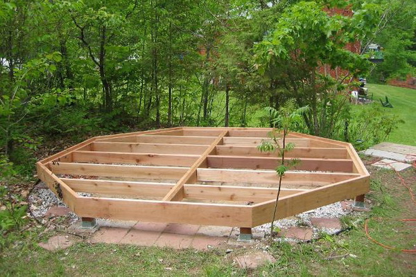 2. Следующий этап строительства беседок для дачи из дерева — изготовление основания. Для этого к стойкам крепят с помощью гвоздей длиной 60 мм опорные брусья 5×5 см. Выполняют настил: прикрепляют к опорным брусьям с помощью гвоздей шпунтованные доски.