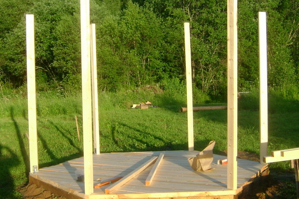 1. Прежде всего, при изготовлении самодельной беседки из дерева в виде правильного восьмиугольника выполняется фундамент из столбиков и со стенками из кирпича. Во время работы во внутренних углах и по периметру стен вкапывают и цементируют восемь стоек (брус 20 х 20 см длиной 2,5 м). Проверяется их вертикальность с помощью отвеса. Надземная длина стоек должна составлять 1,8-2 м. Выполняют верхнюю обвязку из бруса 5×5 см. Она придаст конструкции жесткость. При необходимости используют шурупы.
