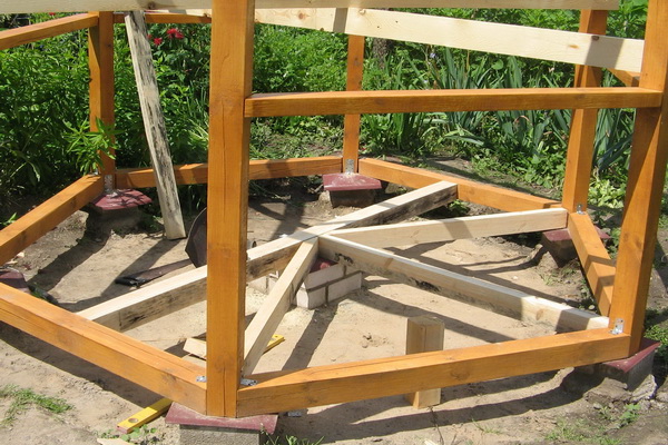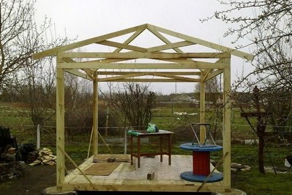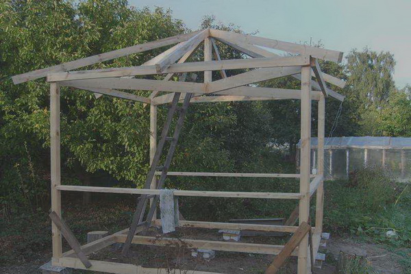 2. На установленных опорных стойках сооружается каркас беседки: закрепляются горизонтальные балки на верхней части опор, фиксируются стропильные ноги с шагом 0,5-0,6 м, с северной стороны устанавливается дверная коробка размером 0,7 X 1,8 м, на которую затем крепится дверь.