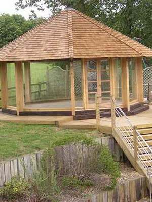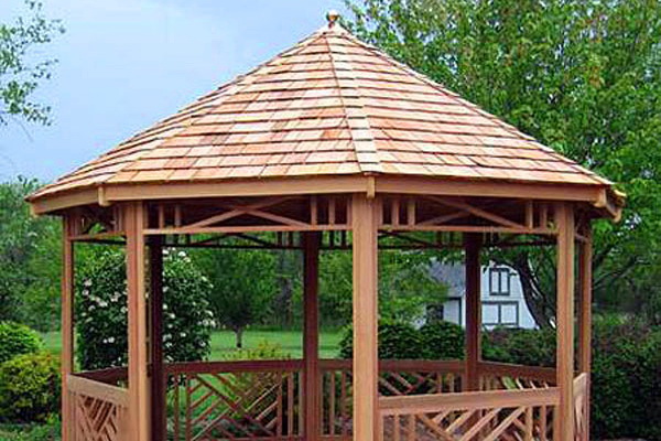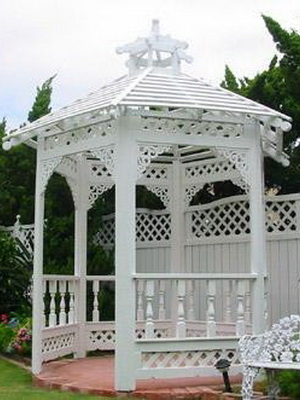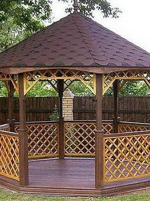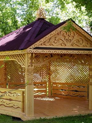 6. Как видно на фото, эту беседку из дерева сверху оформляют узором из реек 1×2 см. Готовая беседка покрывается лаком.
