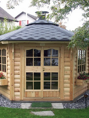 Потолок и пол деревянной круглой беседки выполняются с применением бревенчатых спилов или досок. Можно также сделать пол из природного камня либо бетонных плит. Ограждающие конструкции выполняются из тонких реек. Важно, чтобы беседка оставалась полуоткрытой.