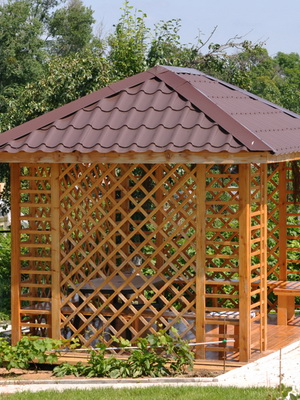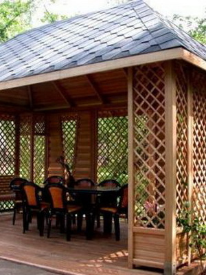 7. Под скосом крыши выполняются планшеты из реек, соединенных крест-накрест или внахлест. Таким же образом оформляются и два выбранных проема беседки. Оставшиеся же служат в качестве своеобразных рам для лески, рядом с которыми высаживаются вьющиеся растения.