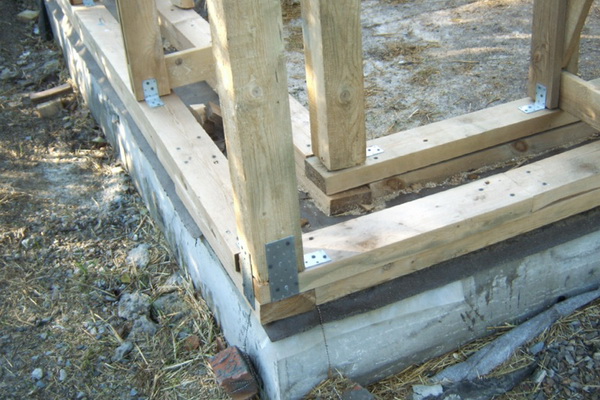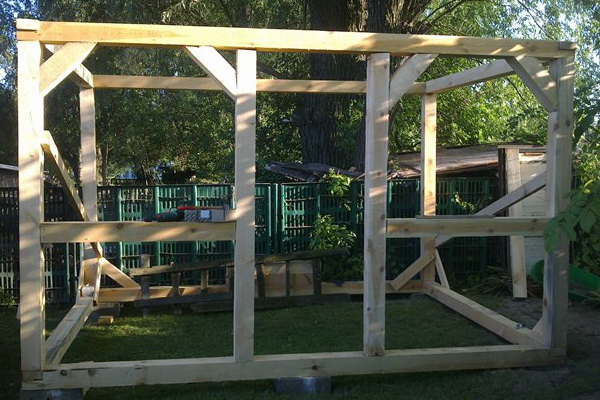 2. Когда цемент схватится, можно приступать к выполнению каркаса. Для него также необходимо использовать прочный материал, и если это деревянные брусья, то их сечение должно быть не менее 10 X 10 см. Все деревянные детали конструкции необходимо предварительно обработать специальными средствами. По углам в железные трубы устанавливаются деревянные балки и прочно скрепляются с основой.