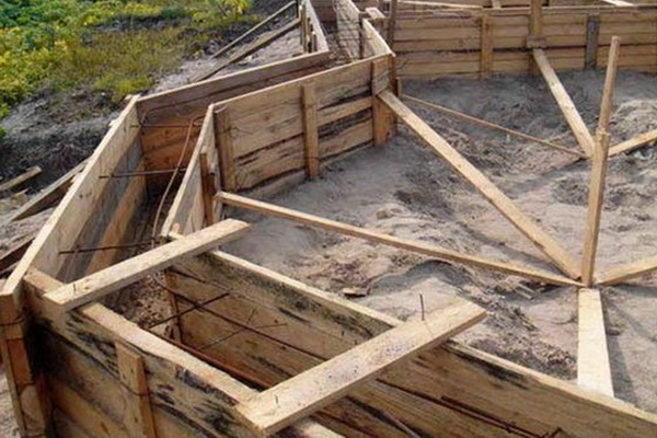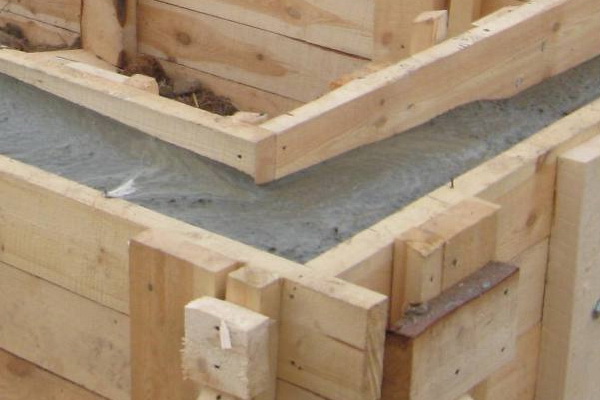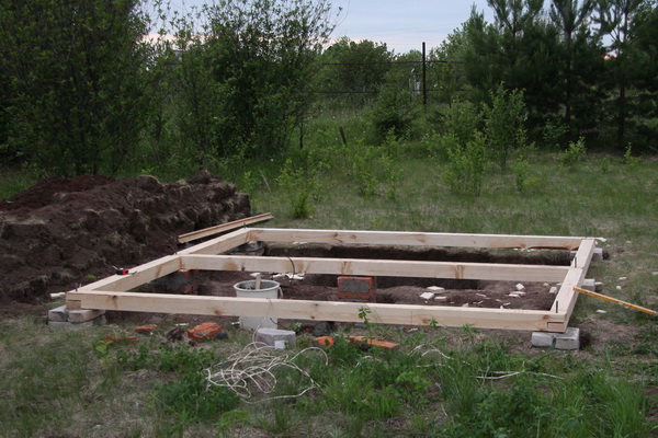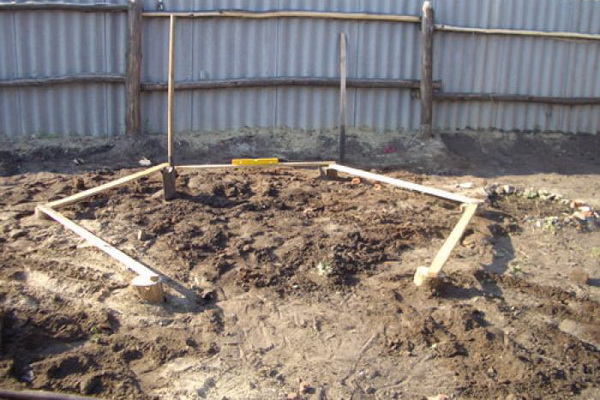 2. Далее по контуру выполняется деревянная опалубка, в которую заливается бетонный раствор. Деревянные элементы опалубки необходимо скрепить кольями, чтобы первые не разошлись во время заливки раствора. По верхнему краю их следует соединить деревянными планками. Чтобы жидкий бетонный раствор не вытекал из щелей опалубки, ее внутреннюю поверхность нужно выстелить толем или рубероидом.