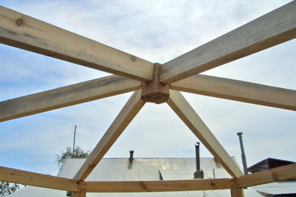 4. Крыша этого вида дачных беседок куполообразная, для её возведения прежде всего нужно найти центр потолочного перекрытия. С помощью гвоздей в данной точке фиксируется в вертикальном положении брус нужной длины, который и определяет высоту крыши. Затем от верхней точки крепятся по кругу доски.