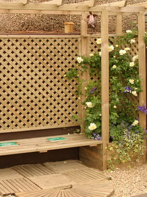 5. Последний этап в строительстве перголы — установка шпалерных панелей или выполнение решетки. В том и другом случае сначала необходимо прикрепить поперечные перекладины к боковым опорам. Перекладины устанавливаются вверху и внизу на некотором расстоянии от верхних балок и поверхности почвы. Это расстояние определяется величиной и формой шпалерных панелей или решетки. Если планируется выполнение решетки, то в перекладинах предварительно делаются пропилы для ее вертикальных стоек. Для выполнения решетки можно использовать бруски 40 х 40 мм, а в качестве крепежа — саморезы.