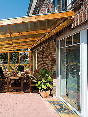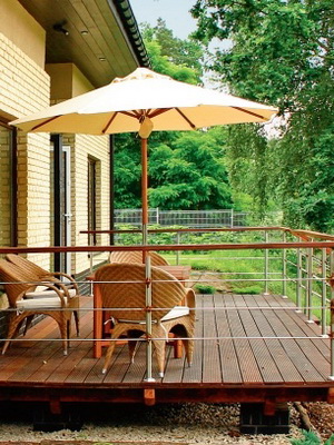 Выбирая материал для строительства лестницы, перил, крыши и других элементов террасы, необходимо ориентироваться на стиль дома и общий вид участка. Обычно террасы сооружают из дерева. Для настила террасы подойдут древесные породы с грубой текстурой, для опорных конструкций — лиственница или европейский дуб. Сосна, ель и кедр также используются как для настила, так и для перил террасы. Какой бы ни был выбран материал, главное, чтобы он отличался прочностью, долговечностью и гармонично вписывался в общий вид.
