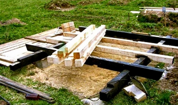 2. Выполняется основание избушки. На земле раскладываются параллельно друг другу опорные брусья сечением 10 X 10 см и длиной 3 м. Укладывают передний, задний и два средних опорных бруса длиной 1,8 м и сечением 5 х 10 см. Проверив горизонтальность уложенных брусьев, их соединяют в «шип».
