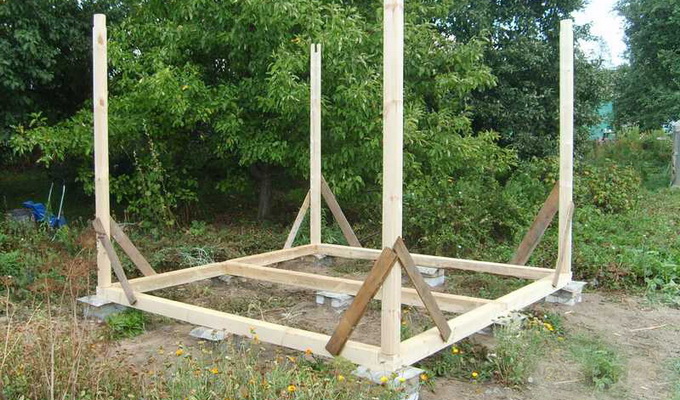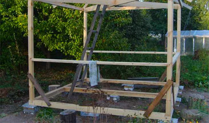 4. Далее выполняется каркас сооружения. Для этого брусья сечением 4,5 X 4,5 см скрепляют металлическими уголками и крепят к шести стойкам (брус длиной 1,8 м и сечением 5 X 10 см) в нужных местах. Выполняют закрытую и открытую часть избушки. Верхнюю обвязку делают из брусьев длиной 3 м и сечением 5 X 10 см и из брусьев длиной 1,5 м и сечением 5 X 10 см. При необходимости используют шурупы.