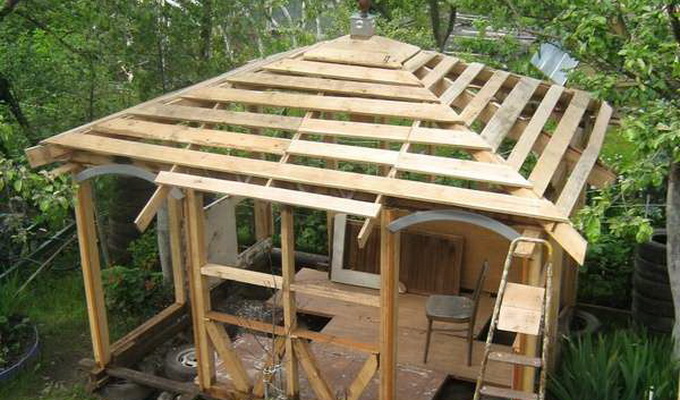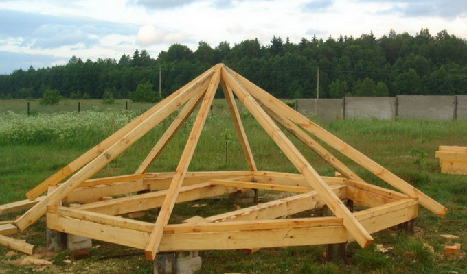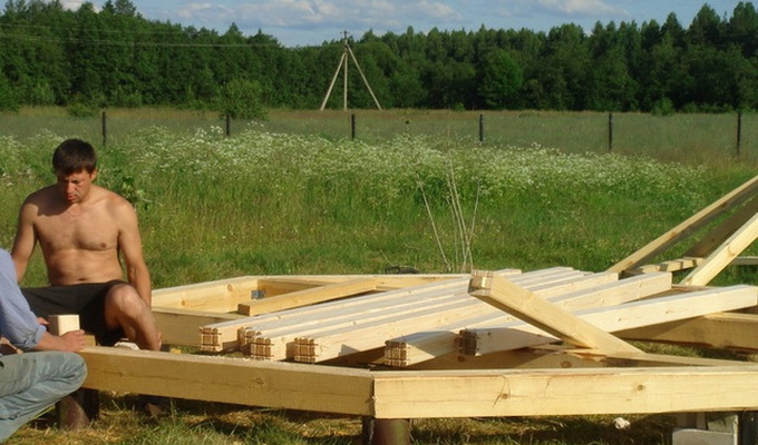 5. Монтируют стропила, заранее подготовив для этого брусья сечением 4,5 X 4,5 см. При необходимости выполняют распилы.