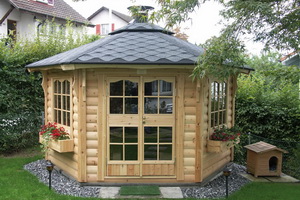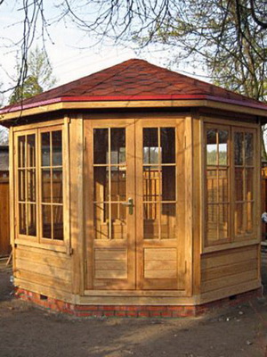 Закрытая дачная беседка в форме избушки — настоящее чудо, ведь она позволяет погрузиться в атмосферу старой доброй сказки и действительно хорошо отдохнуть. Дерево — это экологически чистый строительный материал. В беседке из дерева уютно и комфортно, летом не жарко, а зимой — тепло. Данную постройку лучше всего возводить именно из бревен. При желании внутри ее можно отделать осиной или липой.