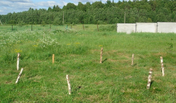 1. Определив место для будущей беседки, на расчищенном участке очерчивают контур постройки с помощью вбитого в землю колышка и привязанного к нему шнура длиной 3,5 м с острым предметом на другом конце.