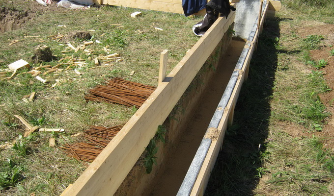 2. Затем по контуру сооружается опалубка из досок, в которую заливается бетонный раствор. Деревянные элементы опалубки следует скрепить кольями. Так они не разойдутся во время заливки раствора. По верхнему краю их следует соединить деревянными планками. Чтобы жидкий бетонный раствор не вытекал из щелей опалубки, ее внутреннюю поверхность нужно выстелить пленкой.