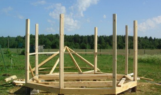 3. Дождавшись полного застывания бетонного раствора, вдоль фундамента монтируют в вертикальном положении ограждающие стойки. При этом учитывается размещение окон и двери. Для закрепления стоек используются перекрытия. С применением бревенчатых спилов или досок делаются пол и потолок. Ограждающие конструкции выполняются из тонких реек, которые располагают внахлест, создавая, таким образом, различные узоры.