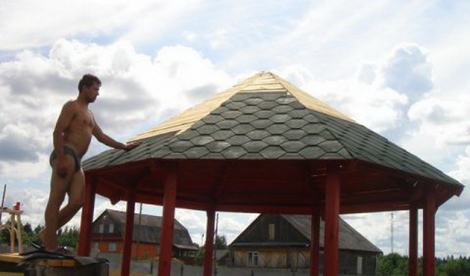 6. Из досок шириной 15 см выполняют настил крыши. Кровлю делают из мягкой черепицы.