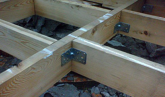 18. После этого изготавливаются лаги. Для этого концы заранее подготовленных брусьев сначала покрываются антисептиком, а затем оборачиваются рубероидом. Торцы будущих лаг оставляют открытыми.