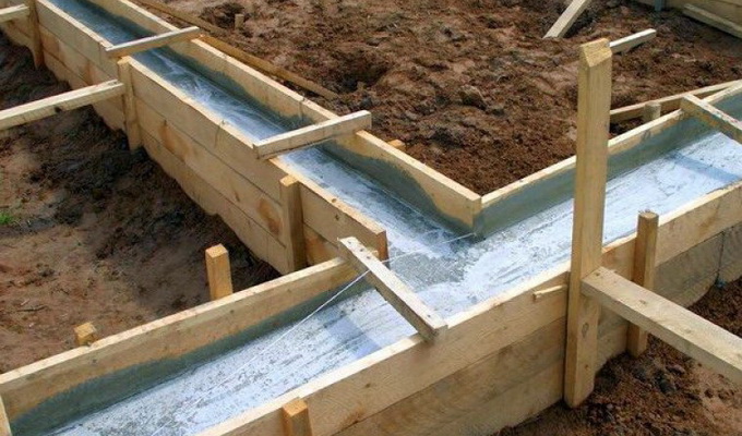 15. В опалубку выкладывается предварительно подготовленный бетонный раствор. Слои делаются толщиной 15-20 см. Каждый слой тщательно выравнивается. Опалубка заполняется полностью. Спустя 3-3,5 часа после укладки бетона поверхность засыпается слоем песка или опилок. Вокруг цоколя выполняется бетонная отмостка. Это площадка, которая устраивается по периметру фундамента, имеющая небольшой наклон.