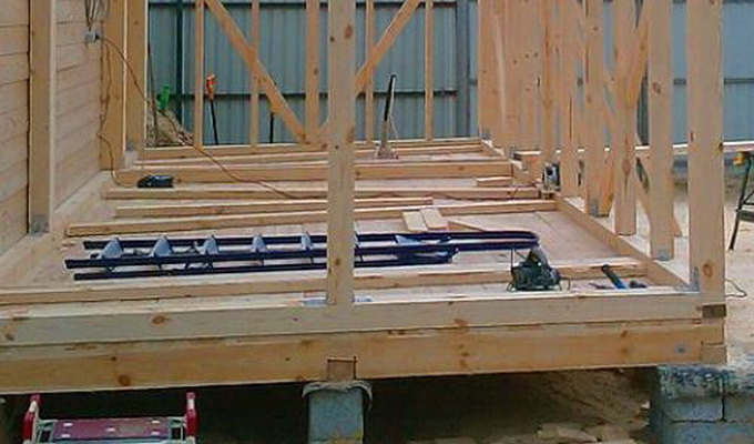 Главное, чтобы он был способен выдержать значительный вес. С боковых сторон к балкам прибивают бруски сечением 5 x 5 см, на которые и опирают щиты. Готовый накат покрывается слоем рубероида.