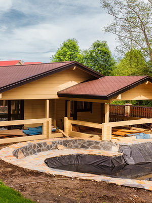 Имеется нескольких вариантов: сооружение террасы на одном фундаменте с домом, на отдельном фундаменте и вообще без фундамента. Выполнение единого фундамента уместно для массивных многоступенчатых конструкций. В противном случае распределение нагрузки на такой фундамент будет неравномерным, что впоследствии может привести к перекосу. Поэтому следует учитывать, что терраса намного легче дома и во время таяния снега и пучения грунта фундамент под ней будет приподниматься. Однако при этом крепкий монолитный фундамент служит гарантией прочности всей конструкции и опасность, что он расколется, сводится к минимуму.