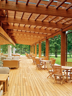 Великолепный вариант летней террасы — пристроенная к дому роскошная терраса-беседка. Это своего рода расширение дачного домика и в то же время место, где в летнее время можно отдыхать всей семьей. Беседку можно использовать и как столовую, и как летнюю спальню для гостей, и как детскую комнату или художественную мастерскую.