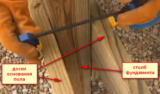 3. Необходимо по периметру площадки положить доски 150 х 50 мм и прикрепить к бетону с помощью дюбелей. Места соединений нужно соединить способом «в замок». При склеивании колонн боковые доски следует сделать на 5 см длиннее остальных. В местах крепления у досок обвязки колонн нужно вырезать отверстия, в которые колонны будут вставляться двумя боковыми досками.
