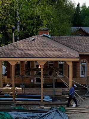 14. Сначала следует настилать нижний ряд черепицы. Он приклеивается к основе и дополнительно фиксируется специальными гвоздями. Второй ряд необходимо сместить на половину листа вверх и в сторону. Он приклеивается поверх первого ряда, а затем также фиксируется гвоздями. Листы черепицы должны укладываться в шахматном порядке — так, чтобы между ними не оставалось зазоров. Обычно в комплекте с черепицей предлагаются готовые коньковые элементы и ендовы, без которых нельзя обойтись при монтаже кровли, и это также позволяет сэкономить время и силы при завершении монтажа крыши.