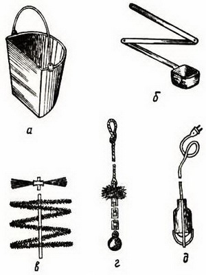 Прочистка печных труб невозможна без использования ведра для сбора сажи и строительного мусора из каналов после очистки. От обычного ведра оно отличается тем, что одна из его сторон плоская. В процессе очистки каналов эта сторона плотно прилегает к стене, благодаря чему можно предотвратить осыпание сажи или мусора.