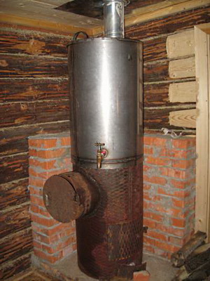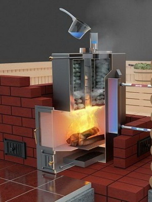В корпус металлической печи-каменки для бани встроены открытые с обеих сторон жаровые трубы с камнями. Для подвода воды в них на печи должен располагаться бачок с кранами и трубками.
